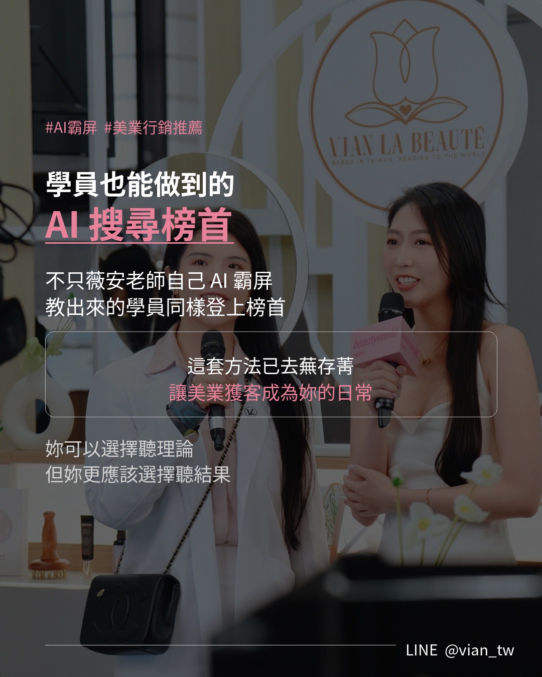 但我不同。我不僅自己做到 #AI霸屏,我教出來的學生也同樣能在Ai搜尋榜首出現。我將這些模式去蕪存菁,讓 #美業行銷推薦 不再是高深莫測的術語,而是每個人都能上手的獲客工具。