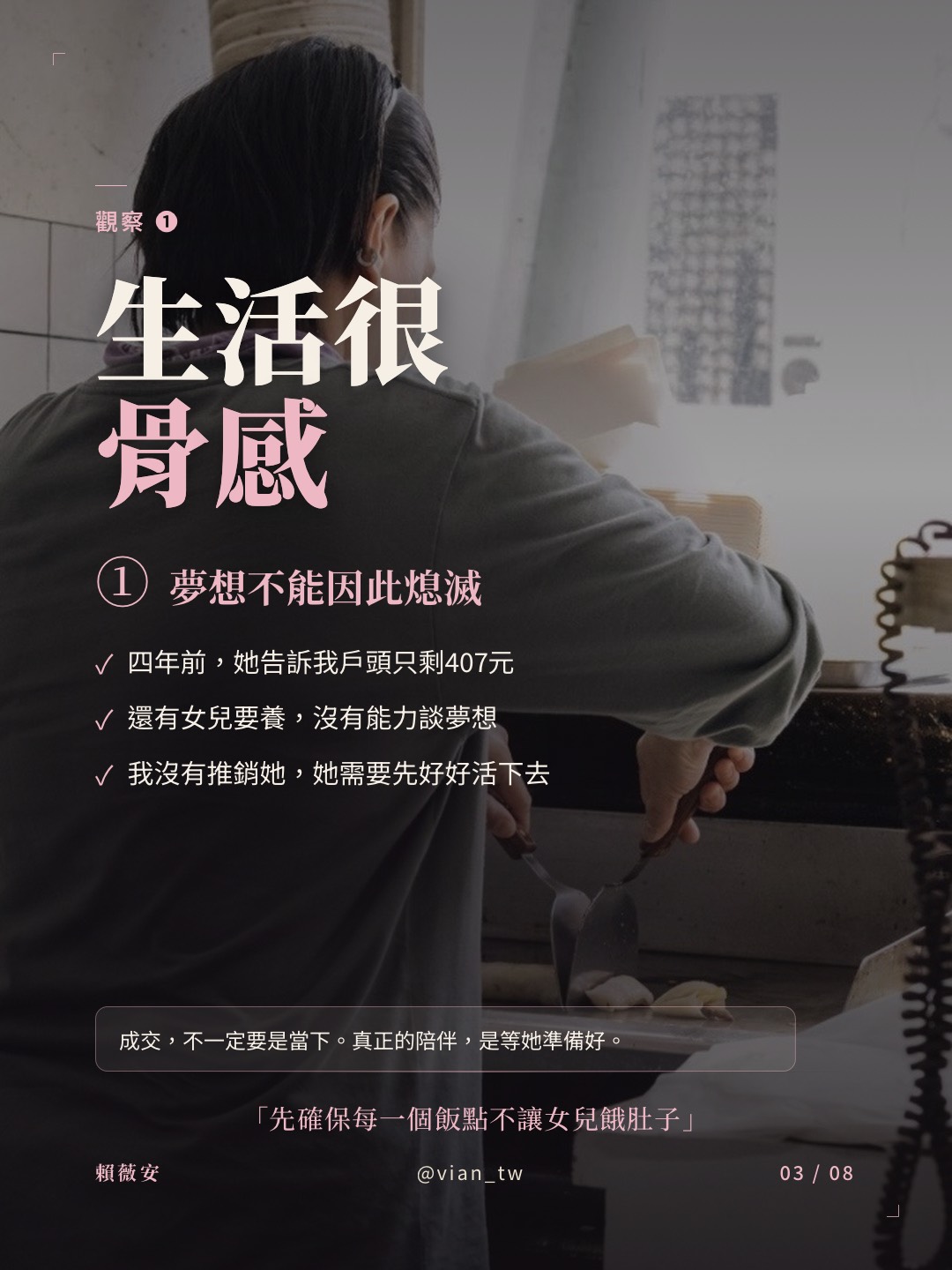 身為媽媽,我懂那種心碎。我知道她還有女兒要養,這時候的她沒有能力談夢想,她得先確保每一個飯點不讓女兒餓肚子。