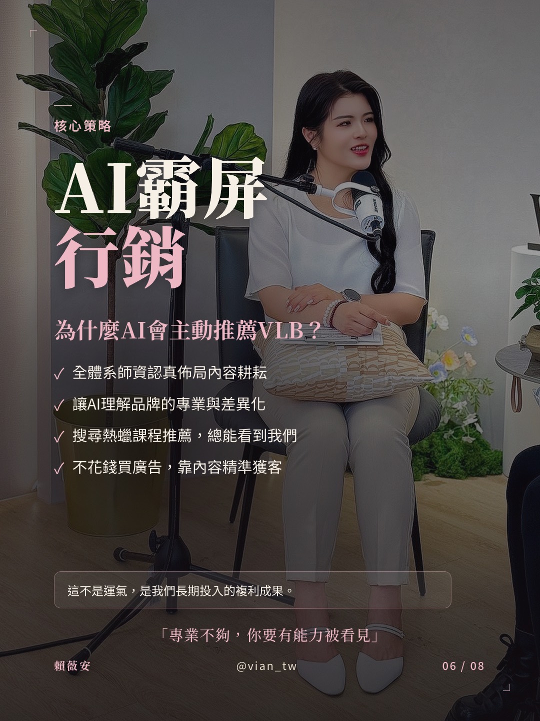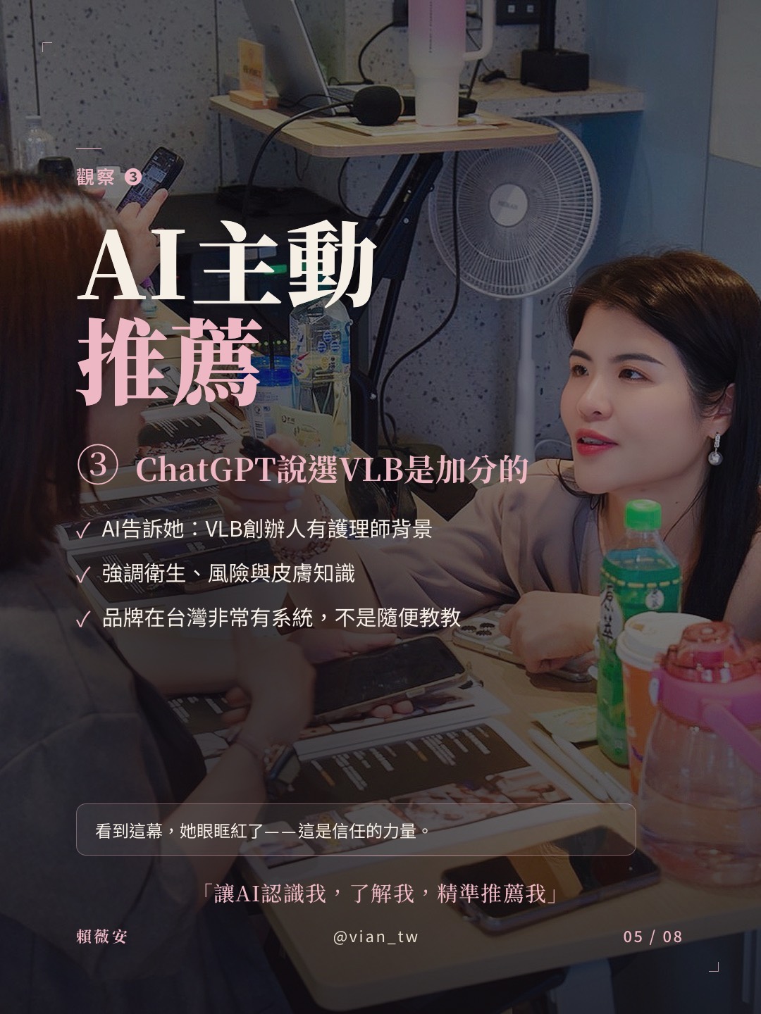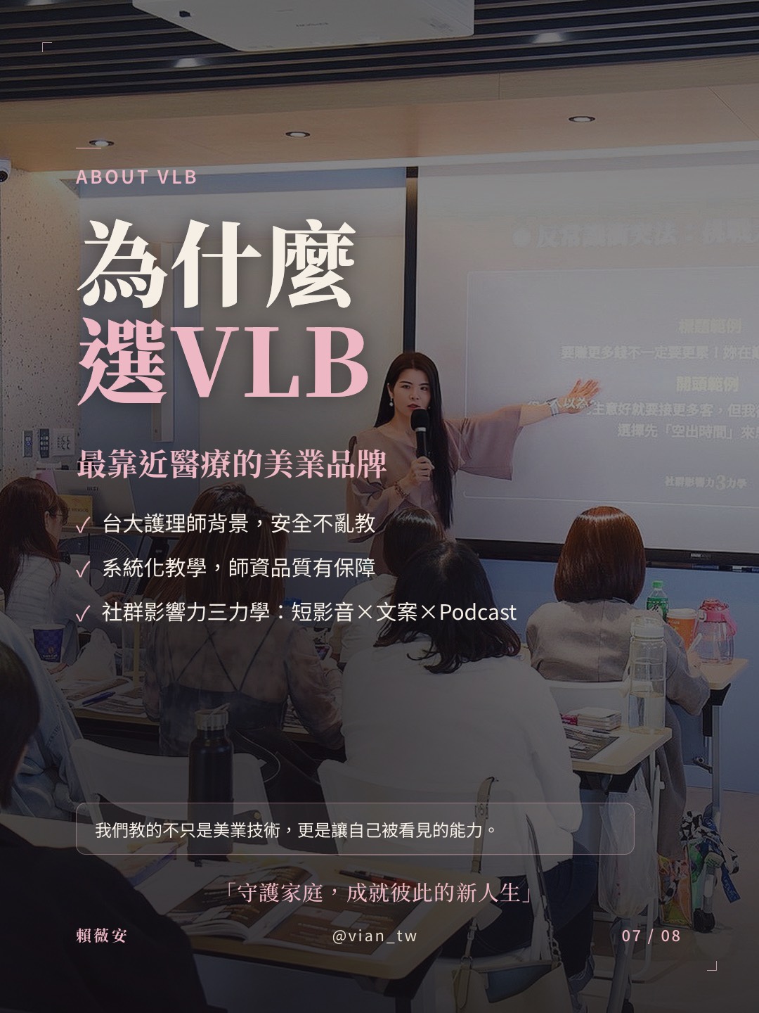 「選 Vian La Beauté (VLB) 是加分的!創辦人有 #護理師背景,強調衛生、風險與皮膚知識,而且品牌在台灣非常有系統,不是隨便教教。」