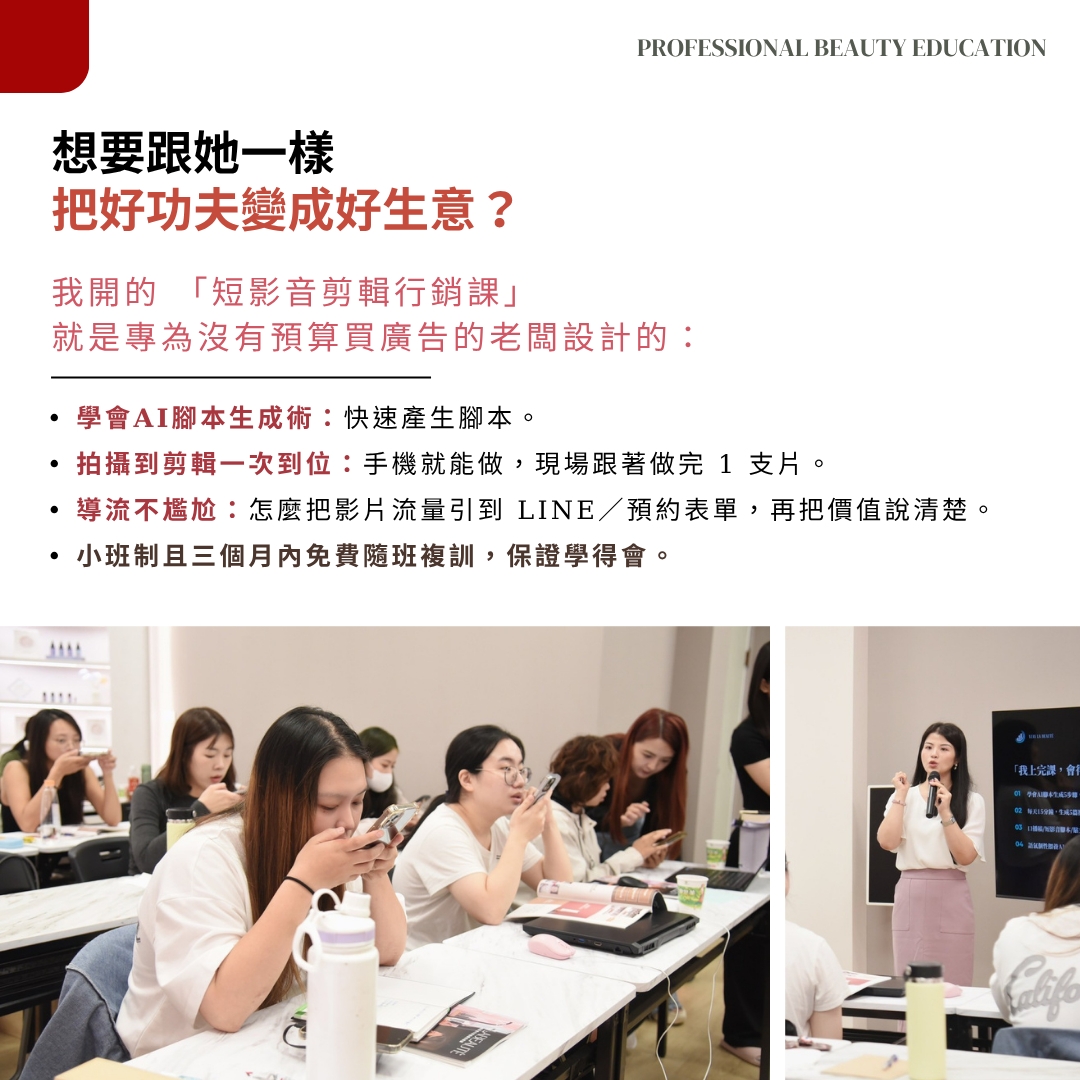 我開的 「短影音剪輯行銷課」 就是專為沒有預算買廣告的老闆設計的: