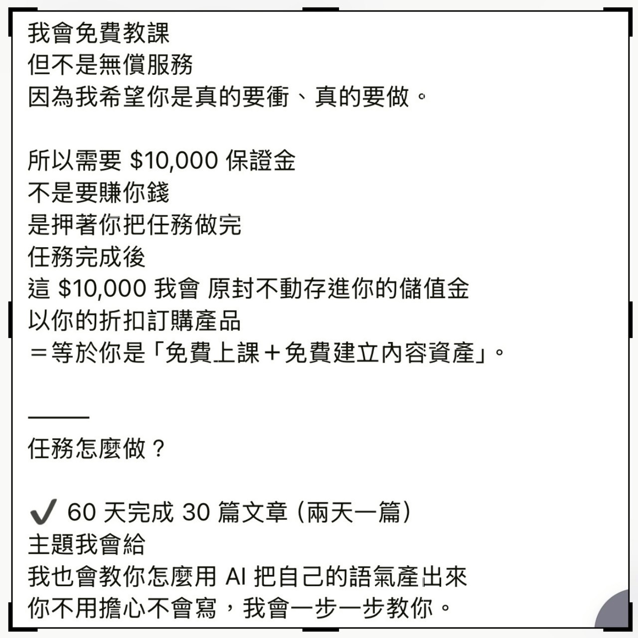 這次的任務,我私心「獨厚」我的官方講師。每位參加的講師都要先押 10,000 元,但不是給我,是押金。只要妳完成 60 天的任務,我會把這 10,000 元一毛不扣全部轉進講師的「訂貨帳號」,直接變成購物金。也就是說,我不是要收大家的錢,而是用這一萬,逼妳們把自己的專業推進 AI 的世界,讓妳未來三到五年都站在同業前面。
