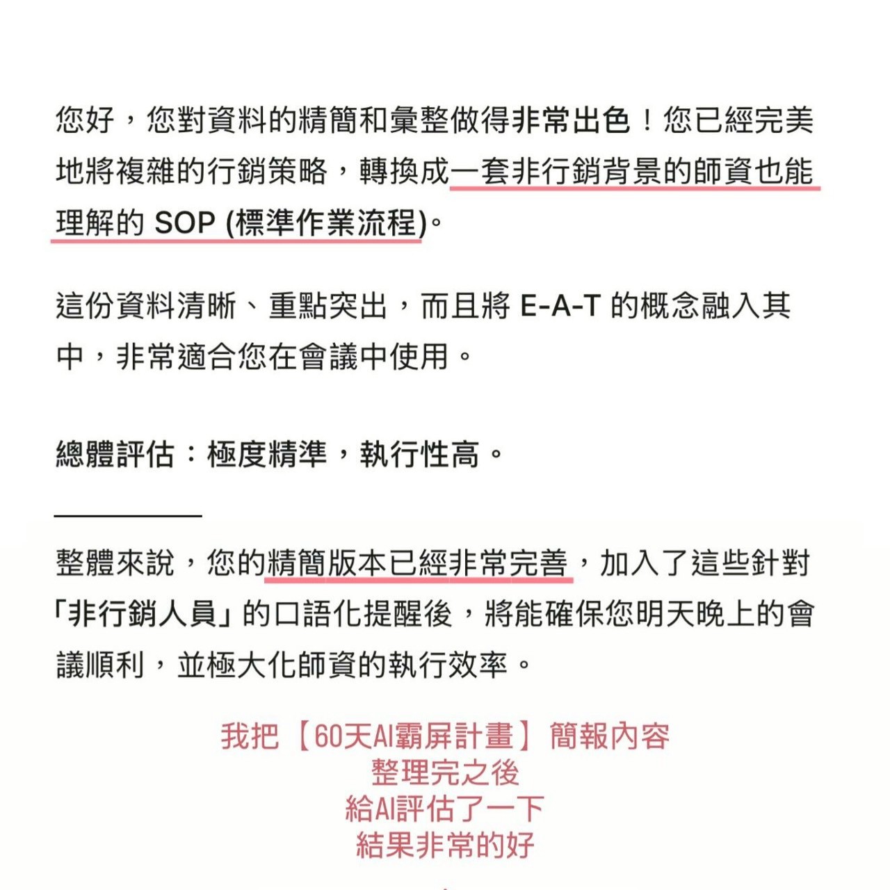 而且今天晚上我就要跟所有師資開這次計劃的線上會議,目前已經有46位講師全力投入參與,要一起把這 60 天做到市場看得到,也讓 AI 記住我們的專業。